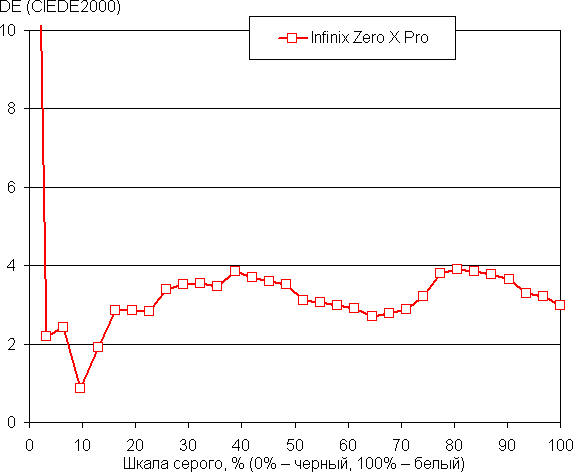 Баланс оттенков на шкале серого компромиссный, так как цветовая температура заметно выше стандартных 6500 К, но отклонение от спектра абсолютно черного тела (ΔE) меньше 10 единиц, что для потребительского устройства считается приемлемым показателем. При этом цветовая температура и ΔE мало изменяются от оттенка к оттенку — это положительно сказывается на визуальной оценке цветового баланса. (Самые темные области шкалы серого можно не учитывать, так как там баланс цветов не имеет большого значения, да и погрешность измерений цветовых характеристик на низкой яркости большая.)