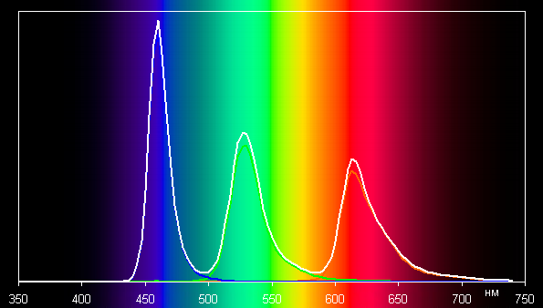 Спектры компонент (то есть спектры чистых красного, зеленого и синего цветов) очень хорошо разделены и перекрестного подмешивания в явном виде нет:
