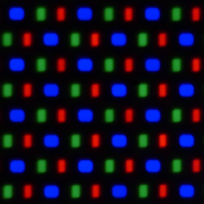 В этом экране используется матрица AMOLED — активная матрица на органических светодиодах. Полноцветное изображение создается с помощью субпикселей трех цветов — красного, зеленого и синего в равном количестве. Это подтверждается фрагментом микрофотографии: