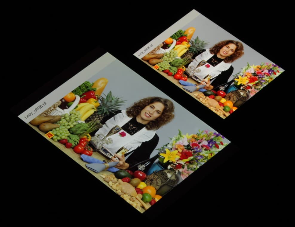 Цвета на экране смартфона перенасыщены (обратите внимание на помидоры, бананы, салфетку и оттенок лица), а цветовой баланс заметно отличается. Напомним, что фотография не может служить надежным источником сведений о качестве цветопередачи и приводится только для условной наглядной иллюстрации. В частности, выраженный красноватый оттенок белого и серого полей, присутствующий на фотографиях экрана Infinix Zero X Pro, при перпендикулярном взгляде визуально отсутствует, что подтверждается аппаратными тестами с помощью спектрофотометра. Причина в том, что спектральная чувствительность матрицы фотоаппарата неточно совпадает с этой характеристикой человеческого зрения.