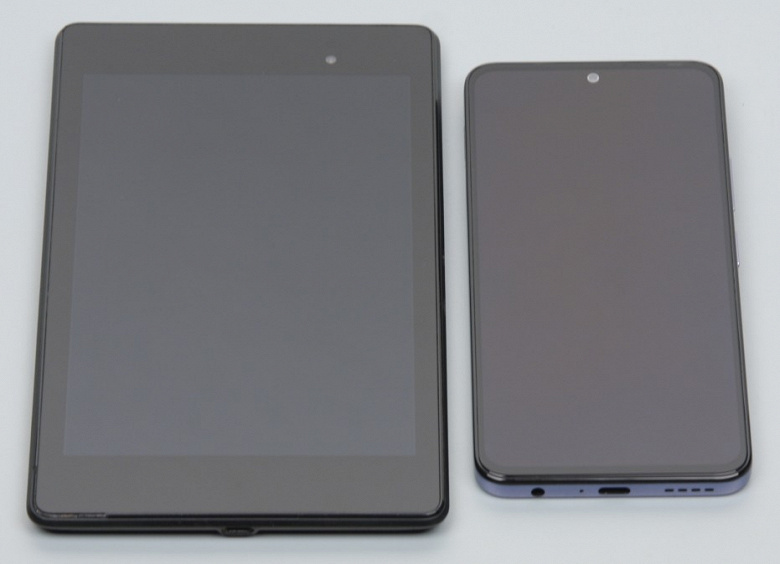 Лицевая поверхность экрана выполнена в виде стеклянной пластины с зеркально-гладкой поверхностью, устойчивой к появлению царапин. Судя по отражению объектов, антибликовые свойства экрана не хуже, чем у экрана Google Nexus 7 (2013) (далее просто Nexus 7). Для наглядности приведем фотографию, на которой в выключенных экранах отражается белая поверхность (слева — Nexus 7, справа — Infinix Zero X Pro, далее их можно различать по размеру):