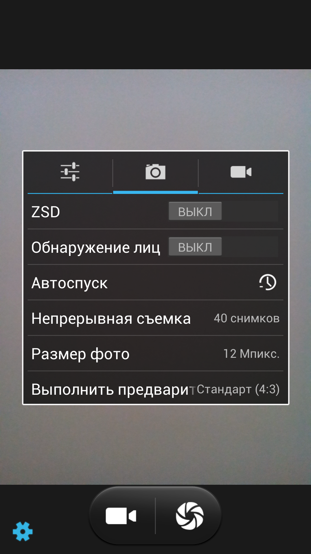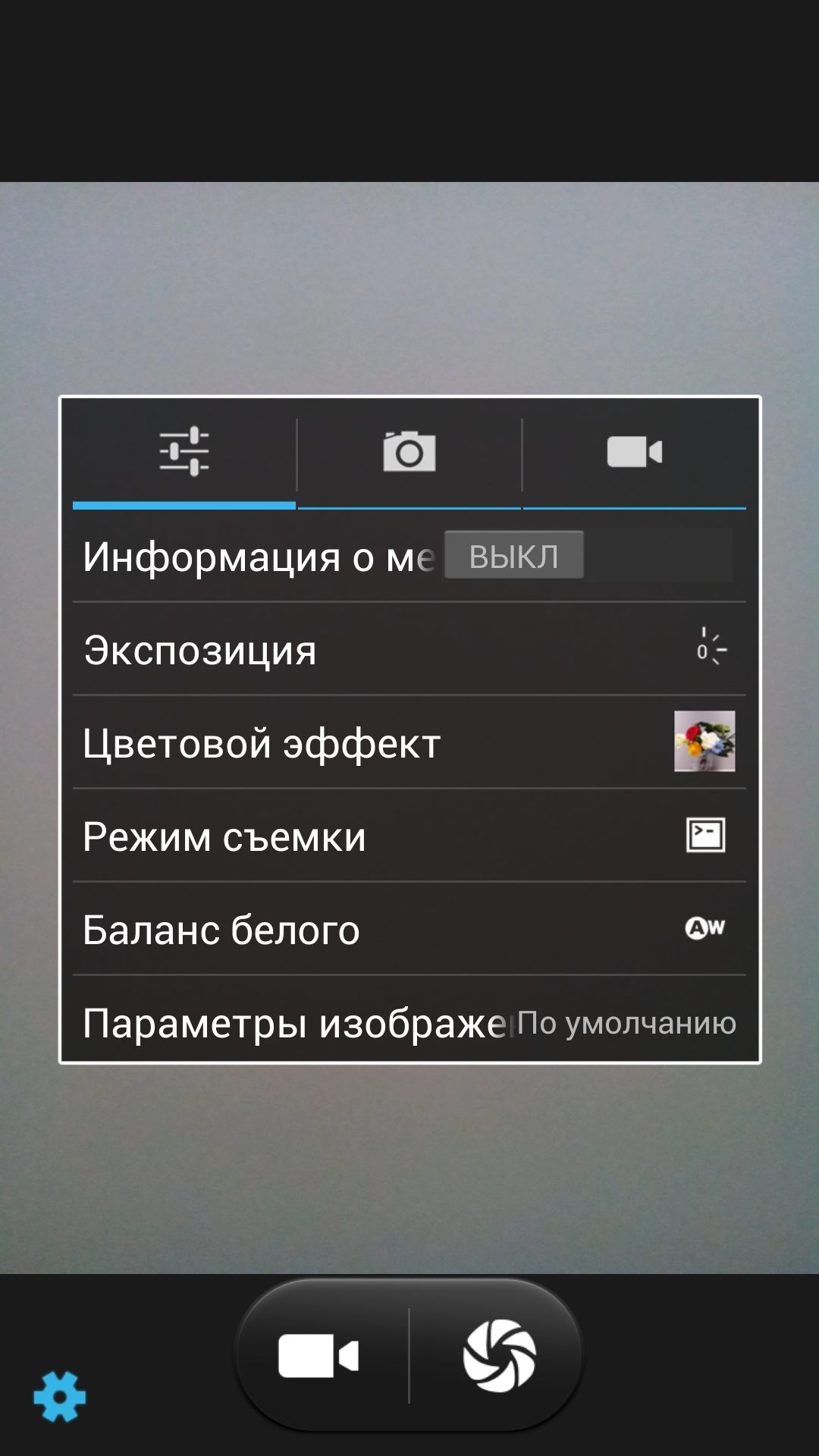 В настройках камеры представлены стандартные опции, среди которых геотеги, параметры изображения, коррекция экспозиции, ISO, эффекты, режим съемки, баланс белого. При удержании кнопки спуска затвора осуществляется запись серии фотографий.