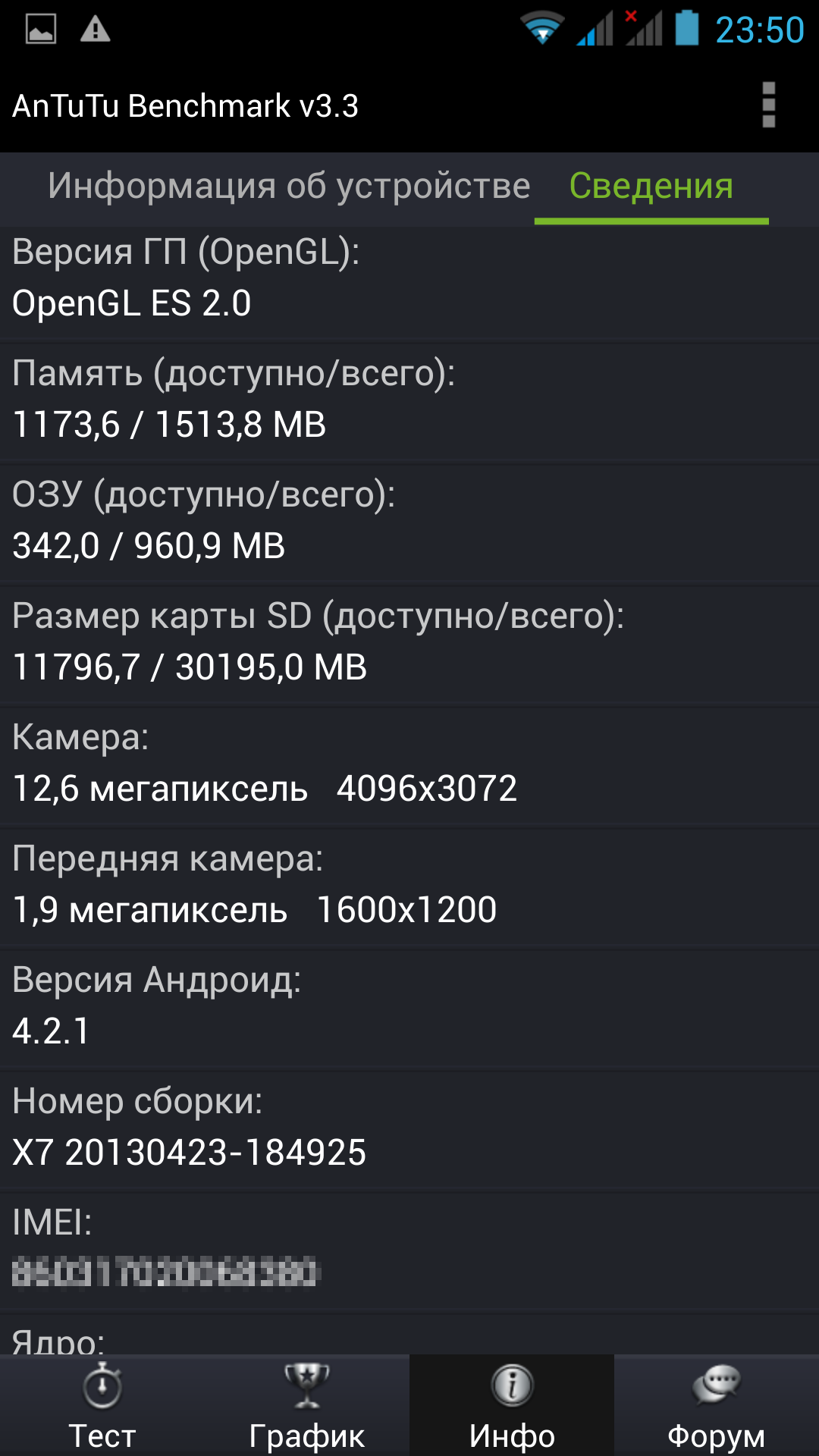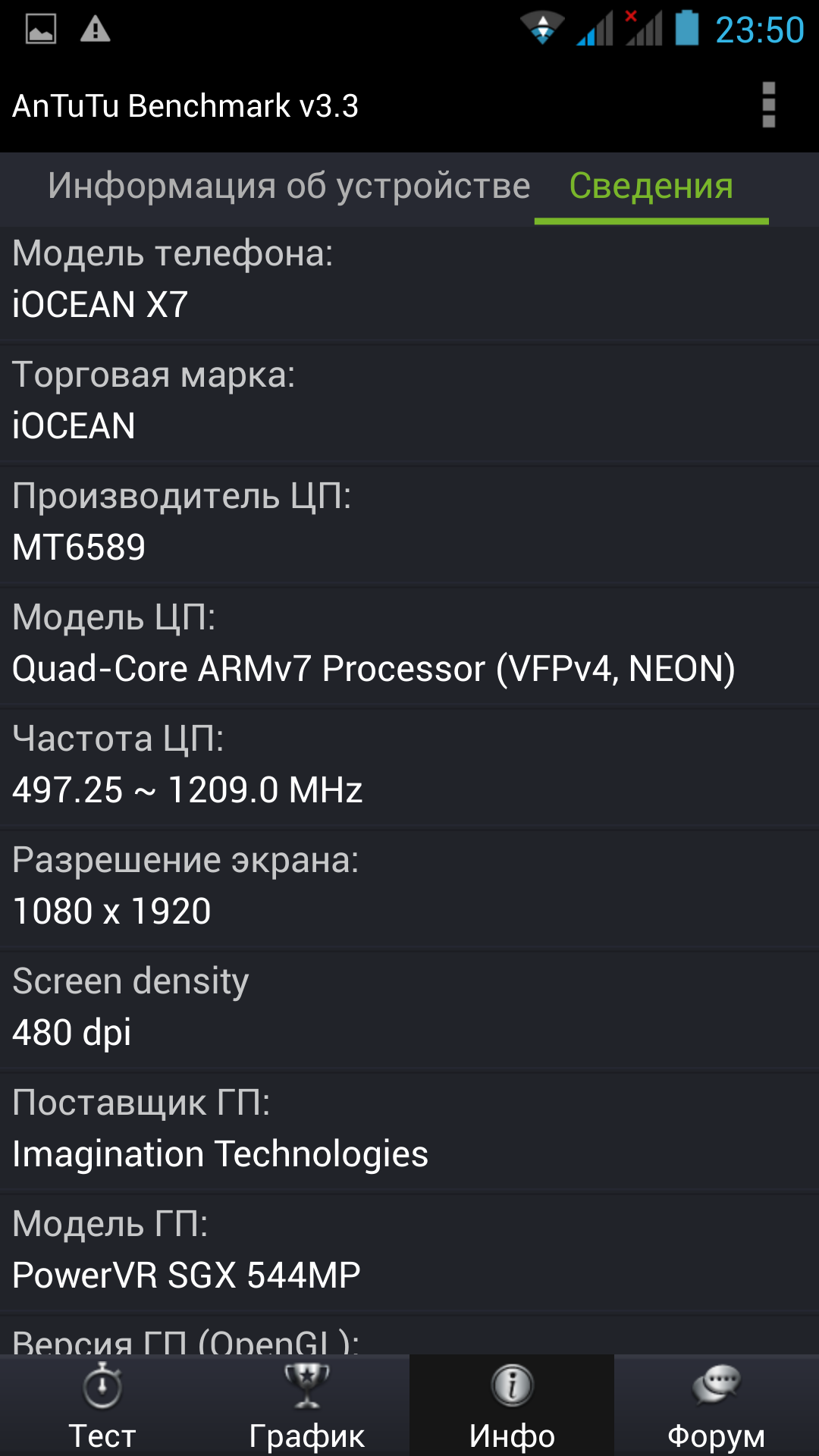 Сайт производителя есть только на китайском языке, но, к счастью, под Android есть множество утилит для выяснения технических характеристик устройств. Как уже ясно по введению, смартфон основан на четырехъядерном SoC MediaTek — MT6589. Ядра основного процессора имеют архитектуру ARMv7 и работают на максимальной частоте 1,2 ГГц. В случае отсутствия нагрузки она может снижаться до 500 МГц (всего есть четыре состояния). Объем оперативной памяти составляет 1 ГБ, что можно оценить как хороший показатель для массового сегмента и средний для топовых моделей (многие из них имеют по 2 ГБ). Графический модуль представлен PowerVR SGX 544MP. Обслуживать ему приходится экран Full HD (1920×1080) размером 5 дюймов.