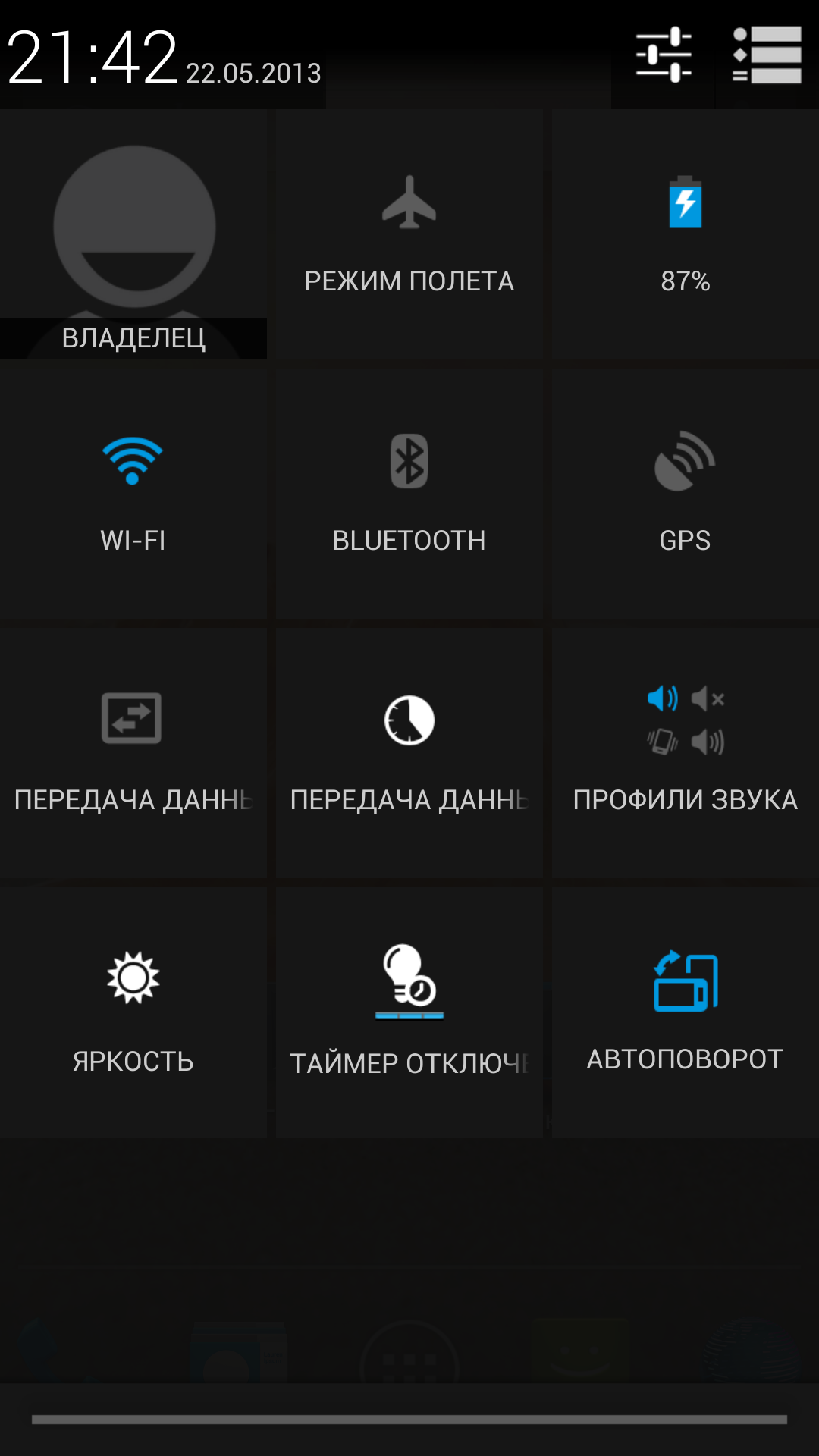 Из понятных дополнительных приложений и особенностей прошивки упомянем Superuser, Taskmanager (простейшая программа для закрытия ненужных приложений), менеджер файлов, утилиту обновления ПО, программу резервного копирования пользовательских приложений на карту памяти, модуль для подключения беспроводных устройств ввода по Bluetooth, дополнительную панель выключателей интерфейсов и выбора режимов, а также пункт перезагрузки в меню выключения питания.