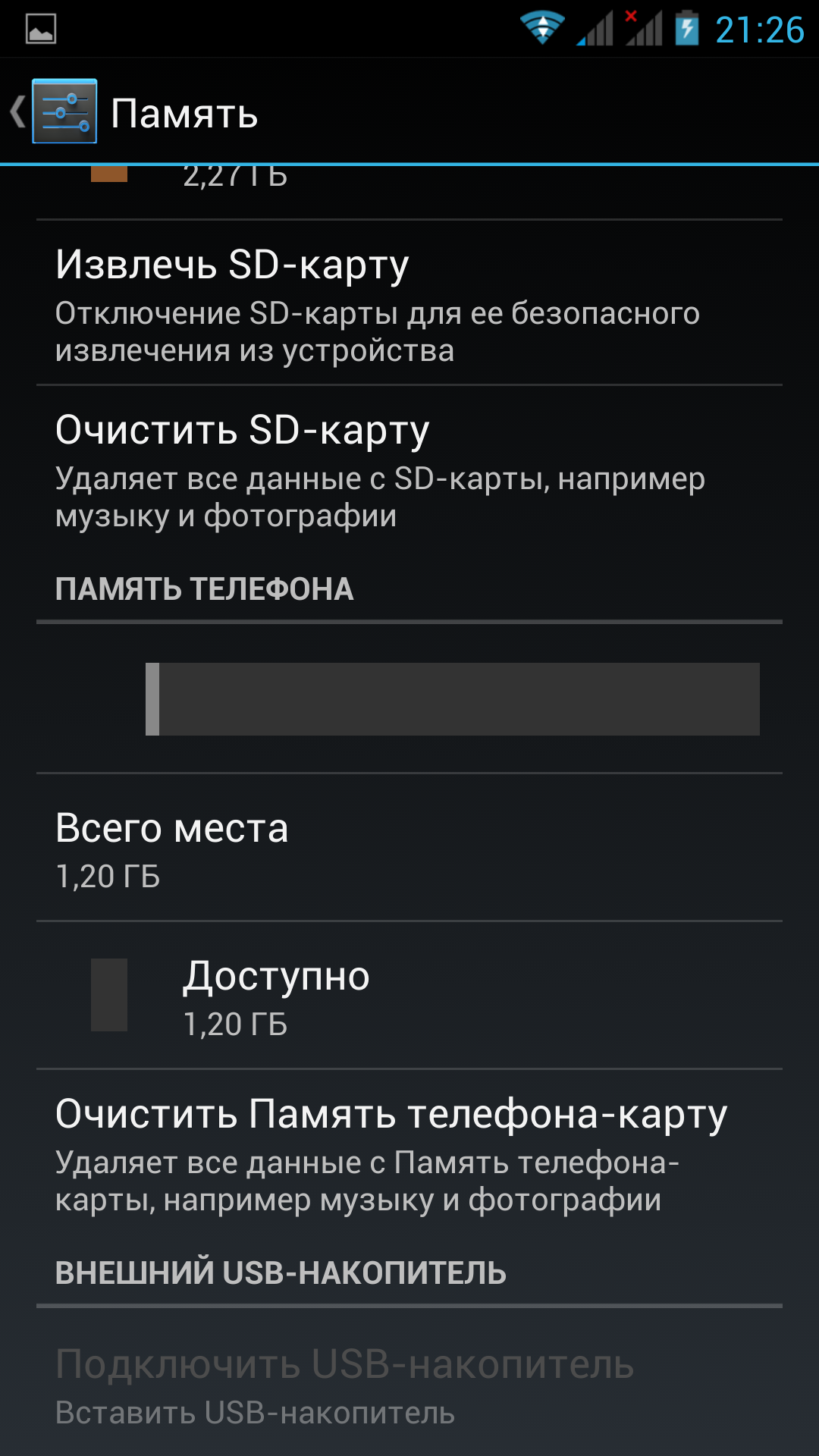 Всего в телефоне есть 4 ГБ флэш-памяти. Из этого объема около 1,5 ГБ отдано для внутренней памяти телефона (для установки программ доступно около 1,35 ГБ), а 1,2 ГБ представлены в виде эмулируемой карты памяти (доступны все 1,2 ГБ). Дополнительно можно (скорее, даже нужно) использовать карты microSD. Поддержки OTG в этой модели нет.