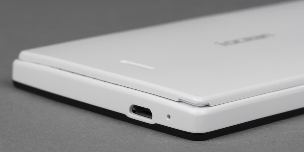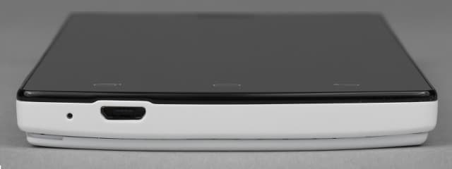 Аудиоразъем 3,5 мм, следуя традиции, установлен на верхнем торце аппарата ближе к правому краю. Для Micro-USB нашлось место снизу, но не как обычно по центру, а слева. Еще ближе к углу — отверстие микрофона.