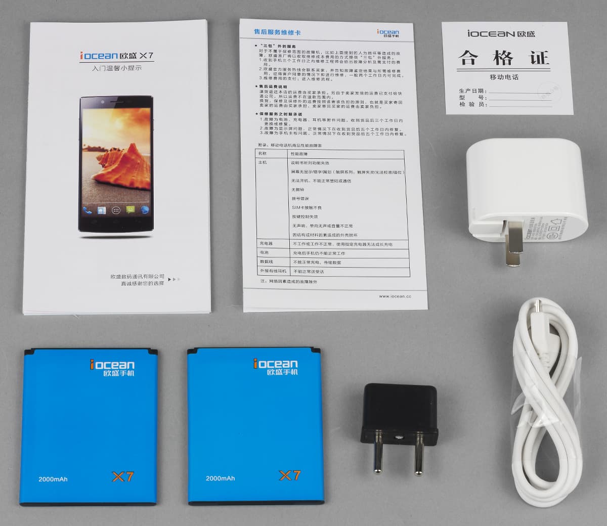 На первом ярусе в пластиковой вставке лежит сам аппарат. Нижнюю часть коробки отдали аксессуарам — зарядному устройству с выходом USB (5 В 1 А), кабелю Micro-USB, двум батареям по 2000 мА·ч, руководству пользователя (только на китайском).