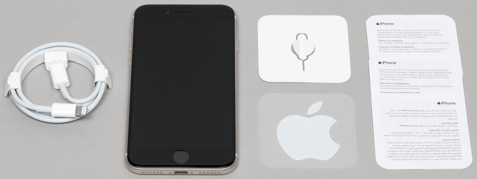 Да-да, теперь здесь нет ни гарнитуры, ни зарядного устройства, а кабель Lightning имеет штекер USB-C на другом конце. Из привычного по прошлой модели — только скрепка, набор листовок и наклейка в виде яблочка.