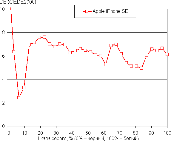 Видно, что в этом случае программного перекрестного подмешивания компонент практически нет, то есть родное для экрана Apple iPhone SE цветовое пространство равно Display P3.