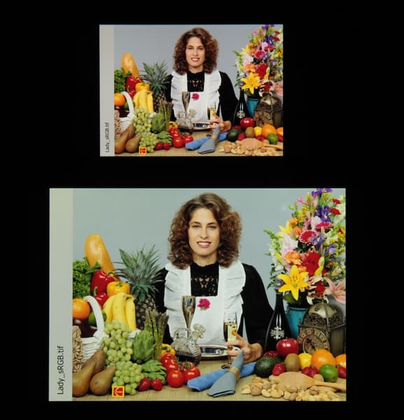 Цветовой баланс немного различается, насыщенность цветов в норме. Напомним, что фотография не может служить надежным источником сведений о качестве цветопередачи и приводится только для условной наглядной иллюстрации. Причина в том, что спектральная чувствительность матрицы фотоаппарата неточно совпадает с этой характеристикой человеческого зрения.