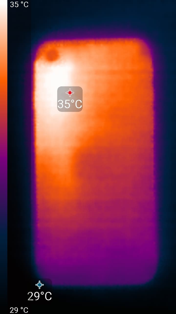 Нагрев больше в верхней правой части аппарата, что, видимо, соответствует расположению микросхемы SoC. По данным теплокамеры, максимальный нагрев составил всего 35 градусов (при температуре окружающего воздуха в 24 градуса), это относительно немного — меньше, чем у SE прошлого поколения (44 градуса) и iPhone 8 (43 градуса).