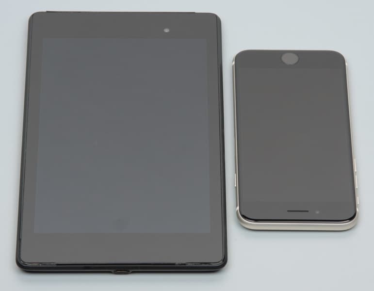 Лицевая поверхность экрана выполнена в виде стеклянной пластины с зеркально-гладкой поверхностью, устойчивой к появлению царапин. Судя по отражению объектов, антибликовые свойства экрана лучше, чем у экрана Google Nexus 7 (2013) (далее просто Nexus 7). Для наглядности приведем фотографию, на которой в выключенных экранах отражается белая поверхность (слева — Nexus 7, справа — Apple iPhone SE, далее их можно различать по размеру):