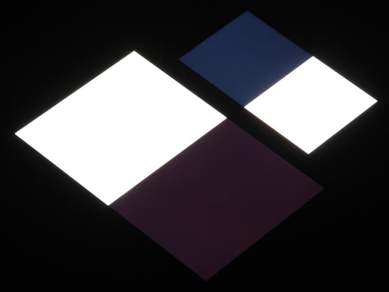 Яркость под углом у экранов уменьшилась (как минимум в 4 раза, исходя из разницы в выдержке), но в случае Apple iPhone SE падение яркости меньше. Черное поле при отклонении по диагонали высветляется в средней степени (чуть больше, чем у Nexus 7) и приобретает фиолетовый оттенок. Фотографии ниже это демонстрируют (яркость белых участков в перпендикулярном плоскости экранов направлении примерно одинаковая!):