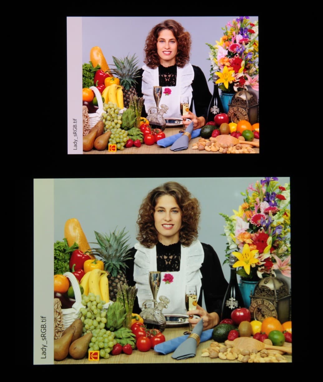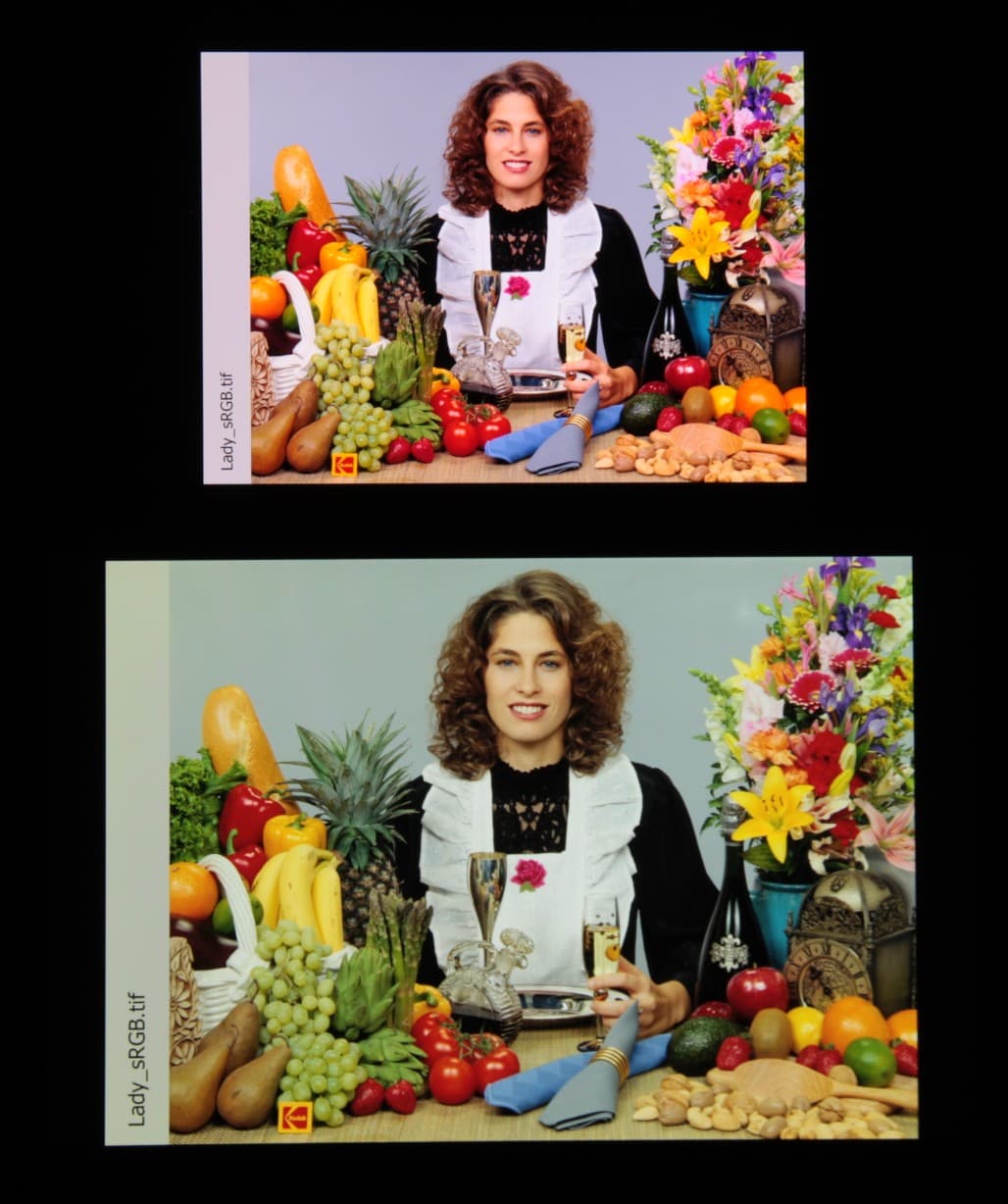 Отметим, что на экранах с широким цветовым охватом без соответствующей коррекции цвета обычных изображений, оптимизированных для устройств sRGB, выглядят неестественно насыщенными. Отсюда и рекомендация: в большинстве случаев смотреть кино, фотографии и все естественное лучше при выборе профиля Профессиональный. Профиль Стандарт уместен при просмотре материала с охватом DCI-P3, принятым в цифровом кинематографе, но в быту встречающимся редко.