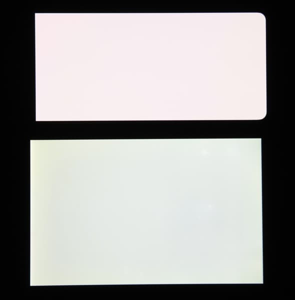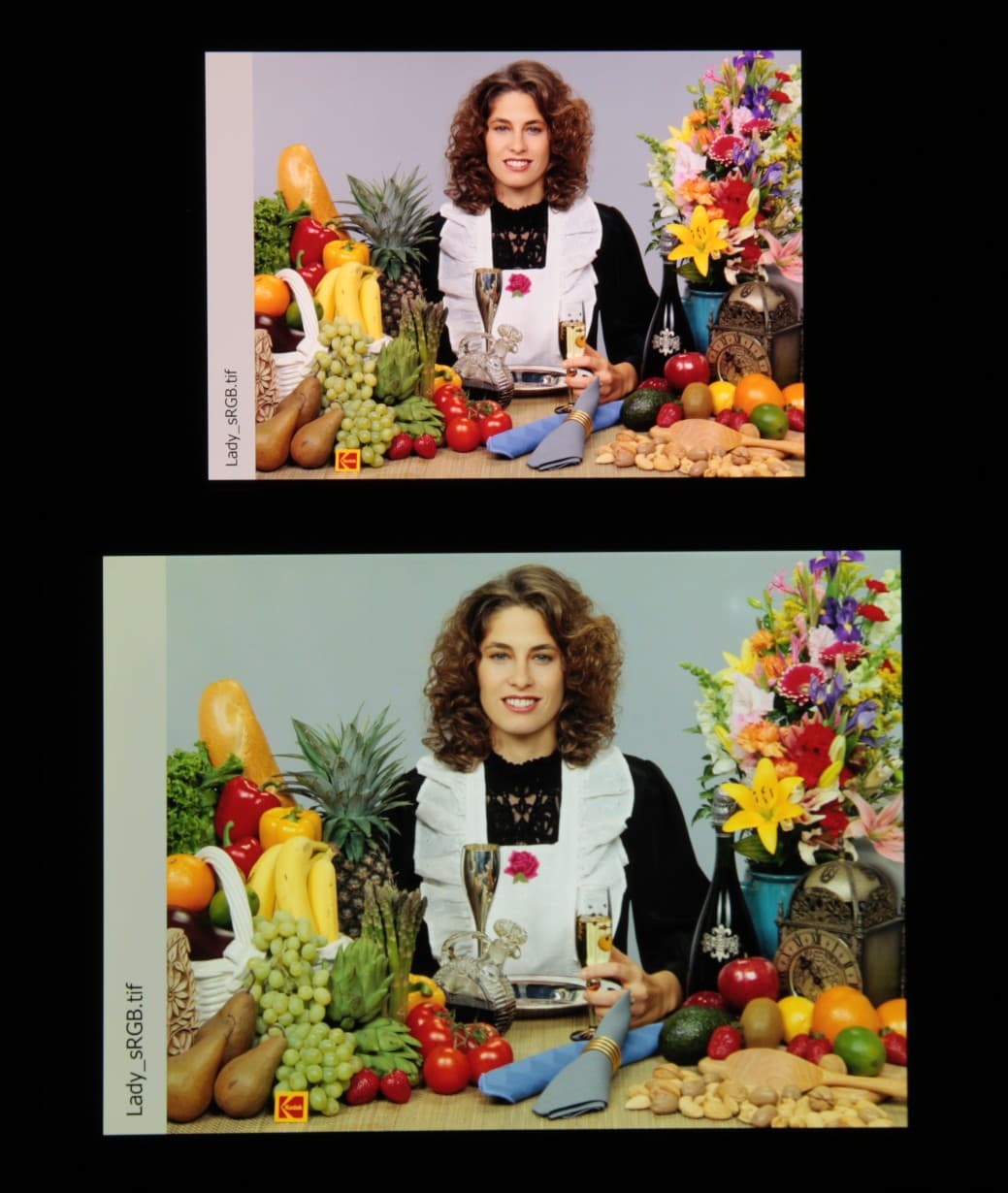 Согласно визуальной оценке, цвета у тестируемого экрана более-менее естественные, а цветовой баланс экранов немного различается. Напомним, что фотография не может служить надежным источником сведений о качестве цветопередачи и приводится только для условной наглядной иллюстрации. В частности, выраженный красноватый оттенок белого и серого полей, присутствующий на фотографиях тестируемого экрана, при перпендикулярном взгляде визуально отсутствует, что подтверждается аппаратными тестами с помощью спектрофотометра. Причина в том, что спектральная чувствительность матрицы фотоаппарата неточно совпадает с этой характеристикой человеческого зрения.