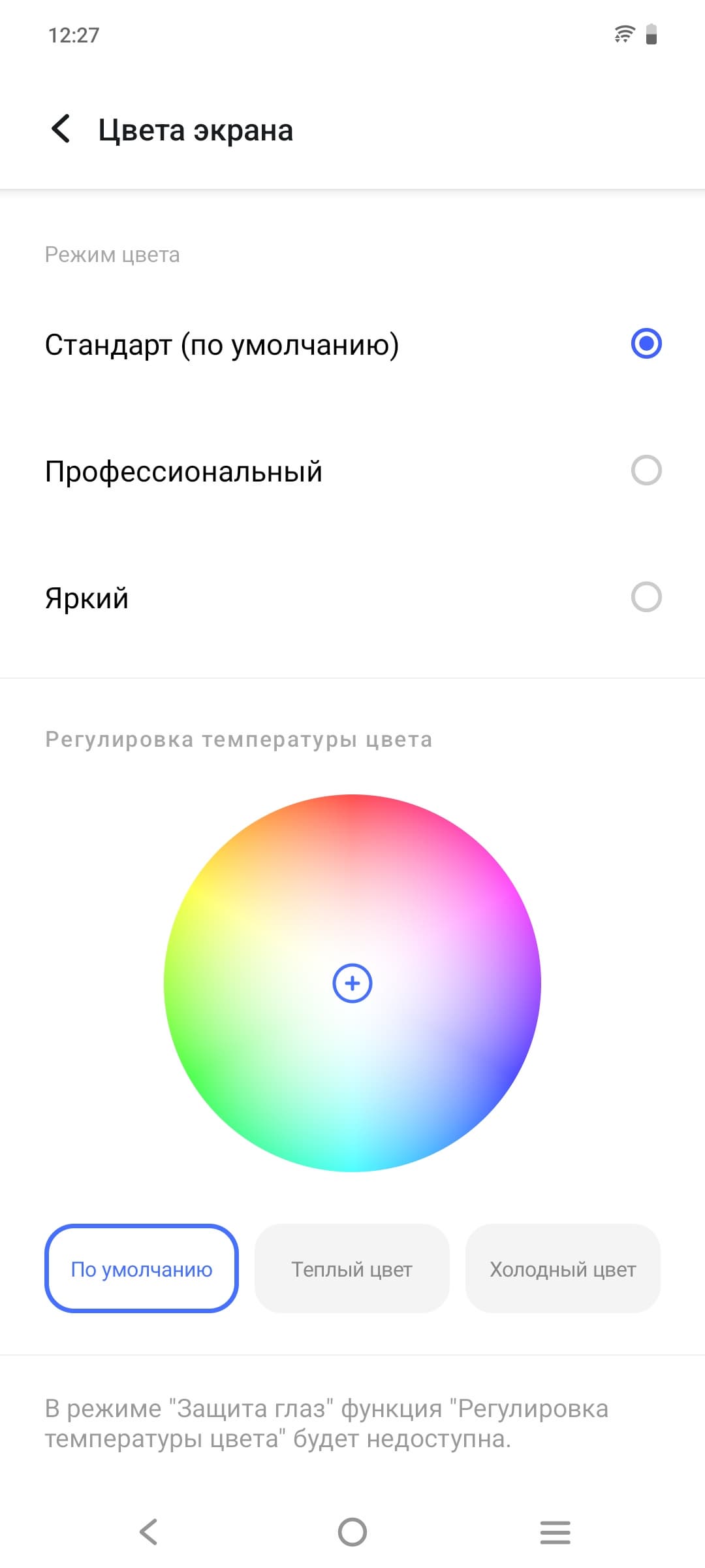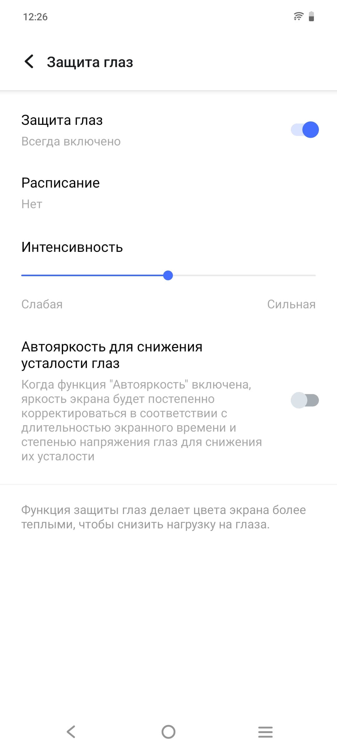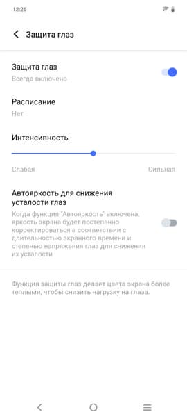 Разумеется, присутствует настройка (Защита глаз), позволяющая снизить интенсивность синей компоненты: