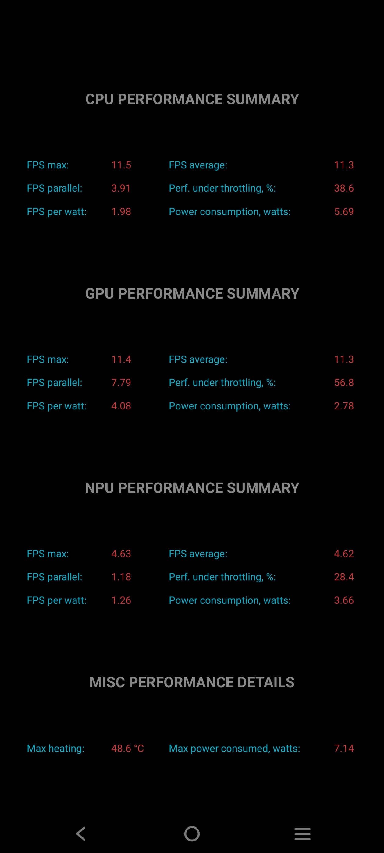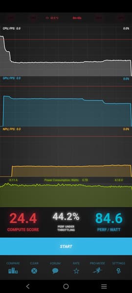 Тест на снижение производительности при нагреве мы проводим с помощью программы Burnout Benchmark, которая позволяет нагружать CPU, GPU и NPU. Наиболее актуальная часть этой проверки показывает, что падение GPU под нагрузкой не слишком большое.