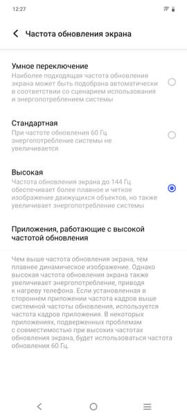 В настройках экрана можно включить режим с повышенной якобы до 144 Гц частотой обновления: