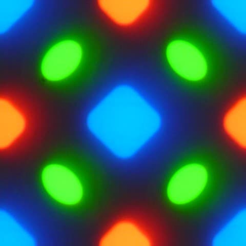 В этом экране используется матрица AMOLED — активная матрица на органических светодиодах. Полноцветное изображение создается с помощью субпикселей трех цветов — красного (R), зеленого (G) и синего (B), но красных и синих субпикселей в два раза меньше, что можно обозначить как RGBG. Это подтверждается фрагментом микрофотографии: