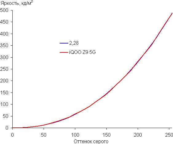 Напомним, что в случае OLED-экранов яркость фрагментов изображения динамично меняется в соответствии с характером выводимого изображения — слегка уменьшается для светлых в целом изображений. В итоге полученная зависимость яркости от оттенка (гамма-кривая), скорее всего, немного не соответствует гамма-кривой статичного изображения, так как измерения проводились при последовательном выводе оттенков серого почти на весь экран.