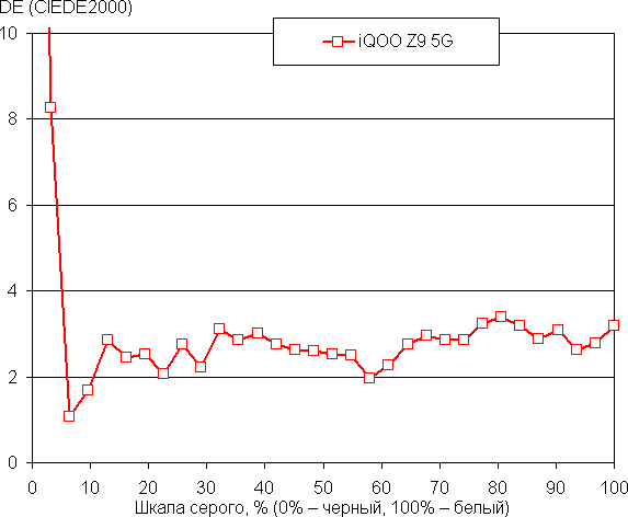 (Самые темные области шкалы серого в большинстве случаев можно не учитывать, так как там баланс цветов не имеет большого значения, да и погрешность измерений цветовых характеристик на низкой яркости большая.)