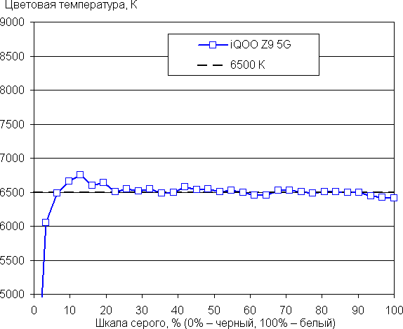 Даже в случае отсутствия дополнительной коррекции баланс оттенков на шкале серого в случае профиля Профессиональный хороший, так как цветовая температура близка к стандартным 6500 К, а отклонение от спектра абсолютно черного тела (ΔE) ниже 10 единиц, что для потребительского устройства считается приемлемым показателем. При этом цветовая температура и ΔE мало изменяются от оттенка к оттенку — это положительно сказывается на визуальной оценке цветового баланса: