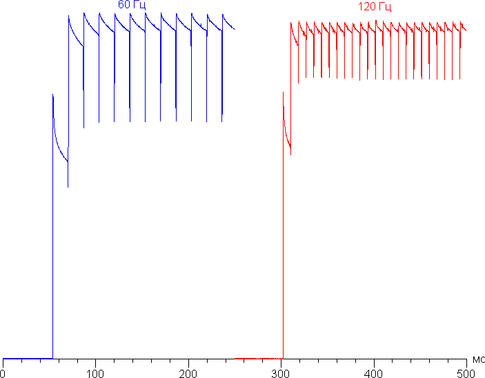 Переключение состояния элементов матрицы выполняется практически мгновенно, но на фронте включения (и реже — выключения) может присутствовать ступенька шириной примерно 17 мс (при частоте обновления экрана 60 Гц) или примерно 8 мс (120 Гц). Например, так выглядит зависимость яркости от времени при переходе от черного к белому:
