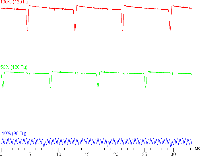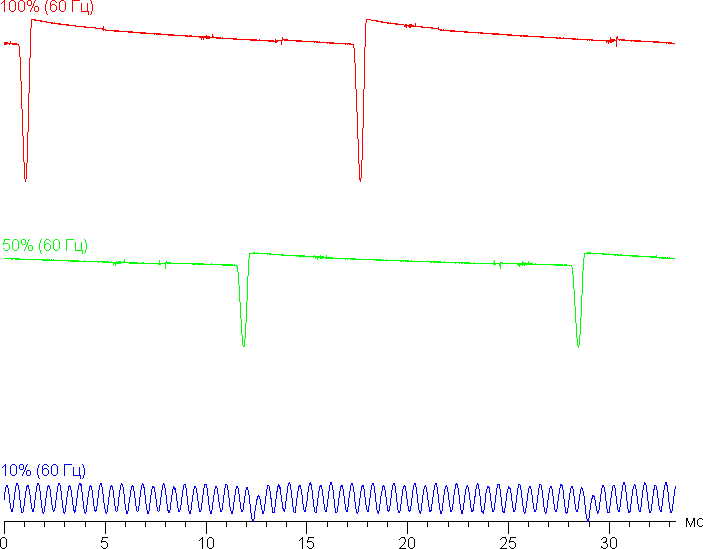 На высоком и среднем уровне яркости присутствует значимая модуляция с частотой примерно 60 или 120 Гц. На рисунке ниже приведены зависимости яркости (вертикальная ось) от времени (горизонтальная ось) для нескольких значений настройки яркости. Сначала для режима с частотой обновления 60 Гц: