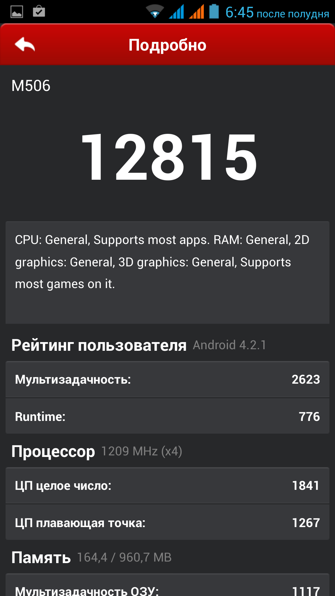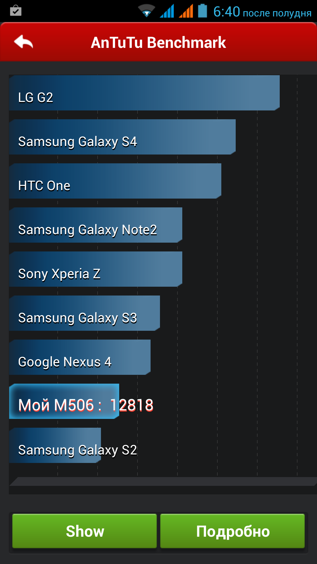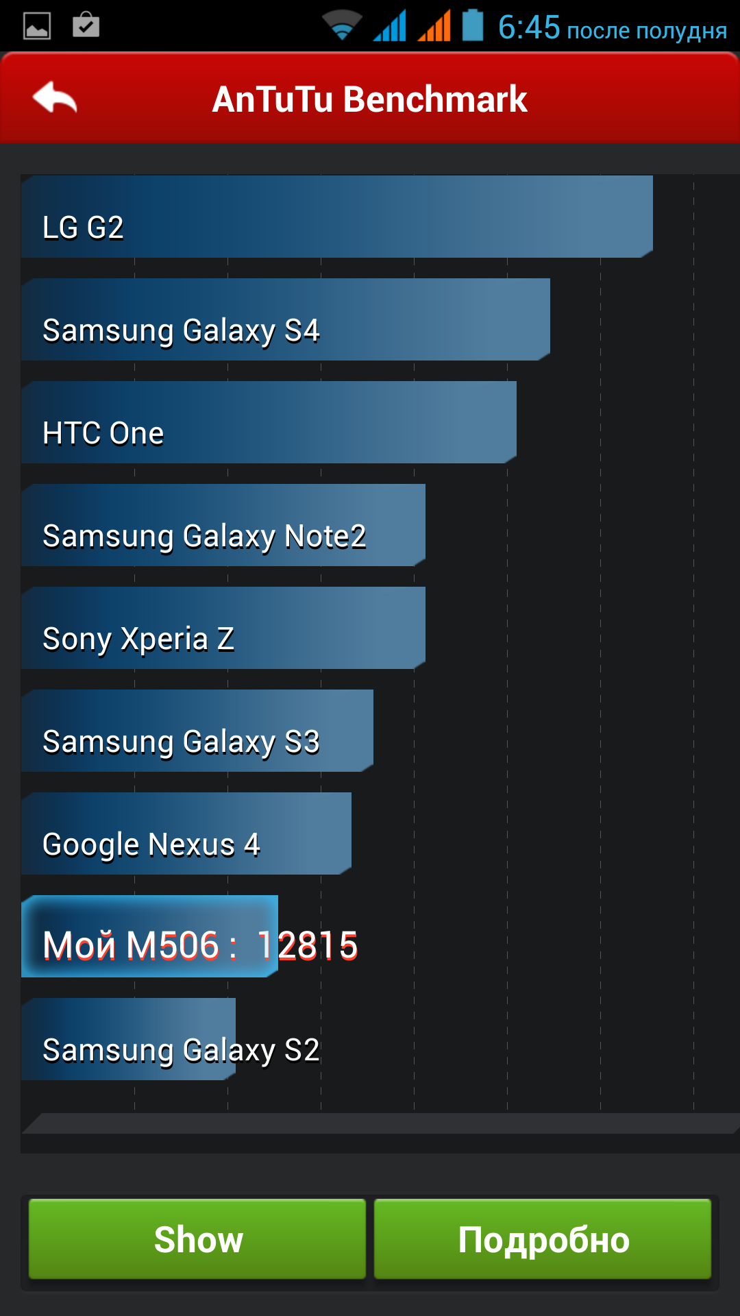 Популярность платформы MediaTek MT6589 такова, что мы в редакции, пожалуй, собрали результаты тестов производительности практически всех возможных аппаратных конфигураций с ее участием. Есть в нашем арсенале тесты и в сочетании с 1 ГБ оперативной памяти и Full HD-дисплеем. Таким образом, ничего нового iRu M506 нам приподнести не сможет, если только его разработчики ничего не «напутали» с прошивкой. Посмотрим на результаты наших традиционных тестов.