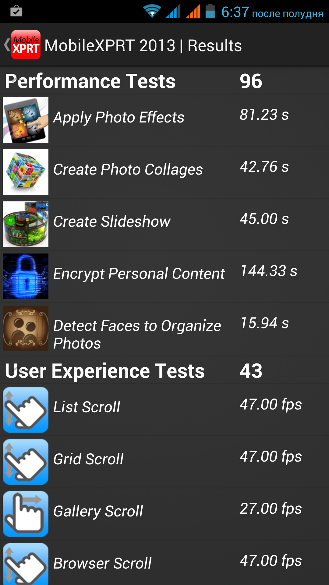 И действительно, герой обзора не преподнес сюрпризов. Результаты тестов всех приведенных смартфонов с SoC MediaTek MT6589 практически идентичны, а увеличенная частота работы вычислительных ядер MT6589T ожидаемо выводит мобильные устройства на ее основе вперед. Стоит отметить совпадение результатов теста быстродействия пользовательского интерфейса системы, MobileXPRT User Experience Test, у героя обзора и у другого смартфона с Full HD-дисплеем — Iconbit Mercury Quad FHD. Интересен также факт, что в этом ключевом, с точки зрения комфорта работы пользователя, тесте у обоих смартфонов зафиксировано двукратное падение производительности по сравнению с соперниками с обычными HD-дисплеями.