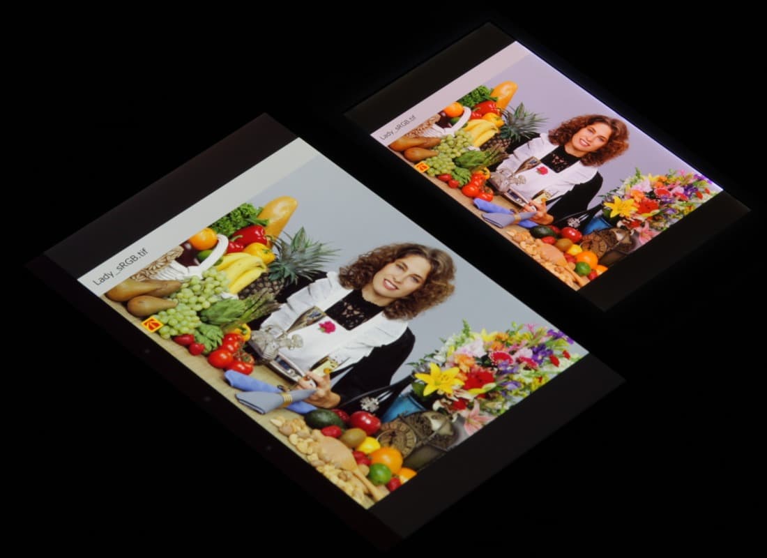 Цвета насыщенные у обоих экранов, но есть очень большие различия в цветовом балансе. Теперь под углом примерно 45 градусов к плоскости и к стороне экрана: