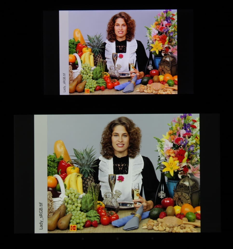 В итоге визуально цвета имеют естественную насыщенность. Баланс оттенков на шкале серого ниже критики, так как цветовая температура заметно выше стандартных 6500 К, отклонение от спектра абсолютно черного тела (ΔE) для части оттенков большое, при этом и ΔE, и цветовая температура значительно изменяются от оттенка к оттенку — это отрицательно сказывается даже на визуальной оценке цветового баланса. (Самые темные области шкалы серого можно не учитывать, так как там баланс цветов не имеет большого значения, да и погрешность измерений цветовых характеристик на низкой яркости большая.)