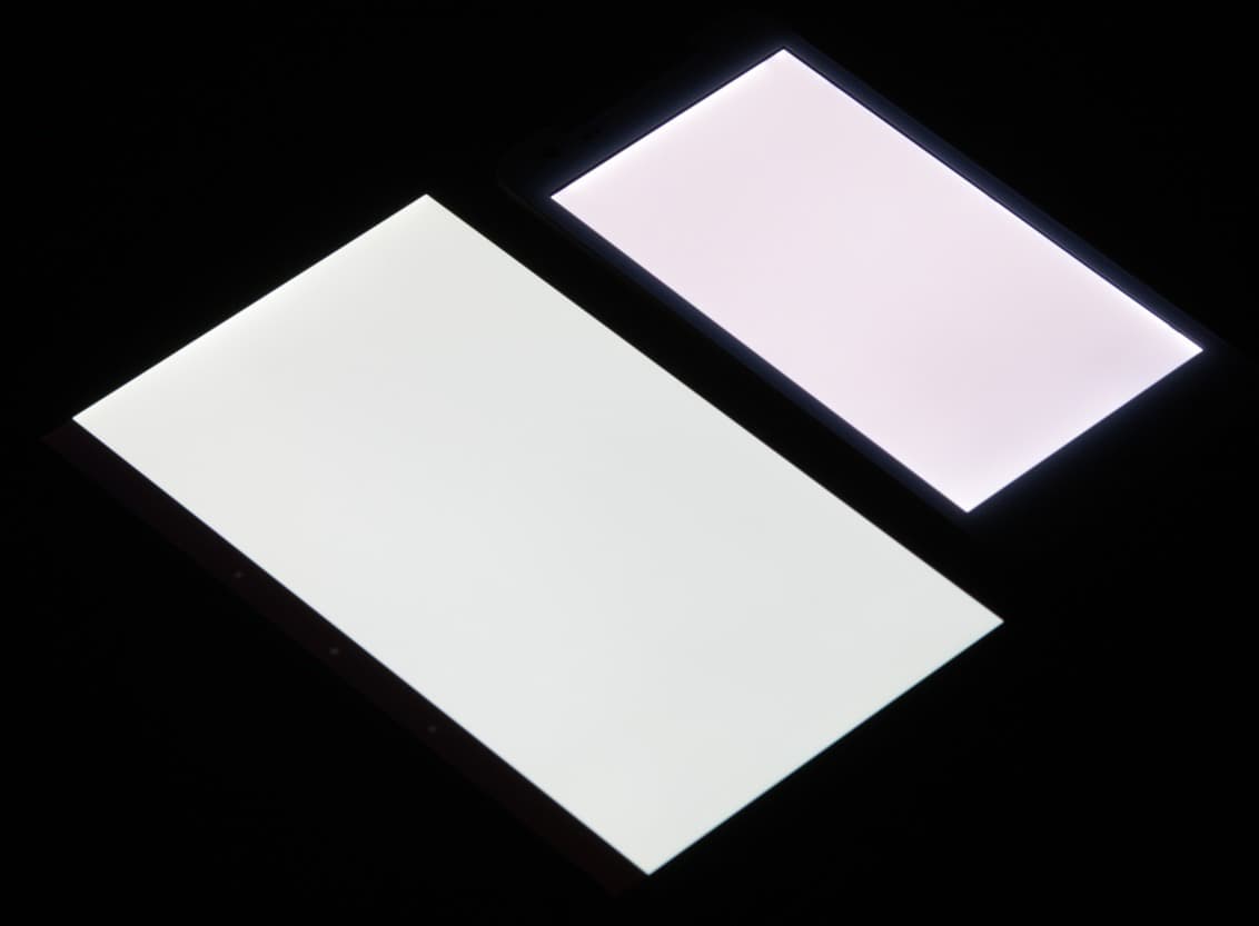Экран имеет хорошие углы обзора без значительного сдвига цветов даже при больших отклонениях взгляда от перпендикуляра к экрану и без инвертирования оттенков. Для сравнения приведем фотографии, на которых на экраны iRU M506 и Nexus 7 выведены одинаковые изображения, при этом яркость экранов изначально установлена примерно на 200 кд/м². Перпендикулярно к экранам белое поле: