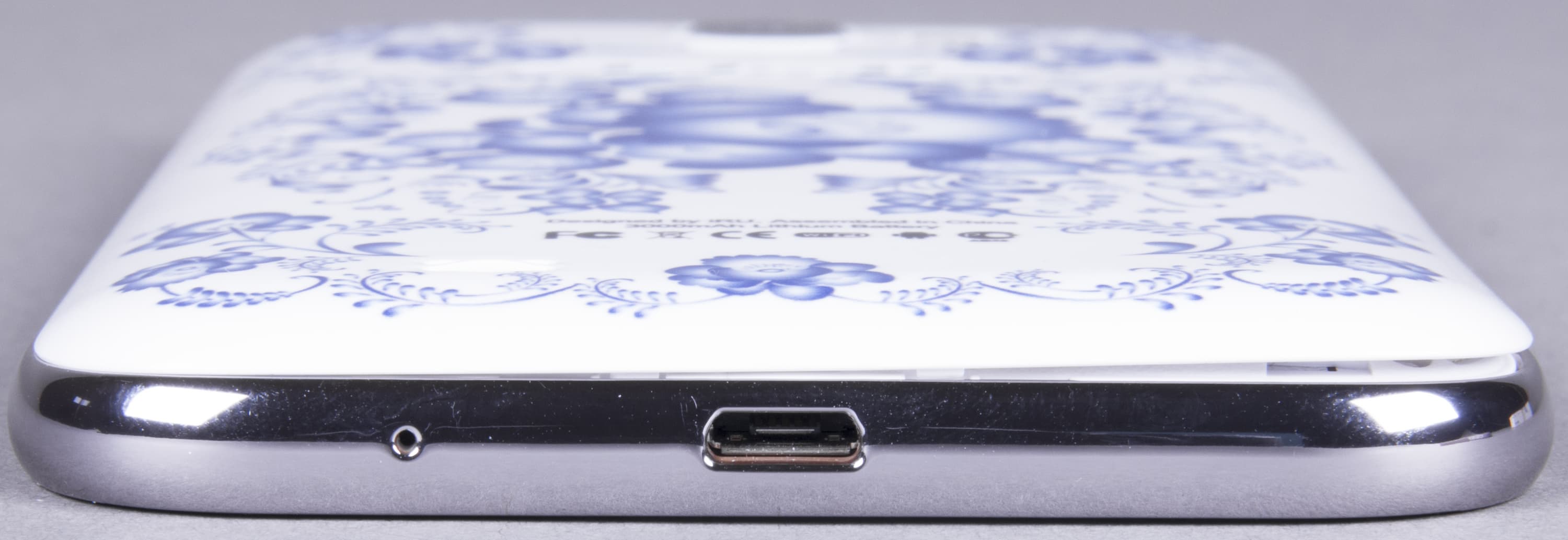 На верхнем торце корпуса IRU M5302 Gzhel находится разъем для наушников 3,5 мм, на нижнем — разъем Micro-USB и микрофон.