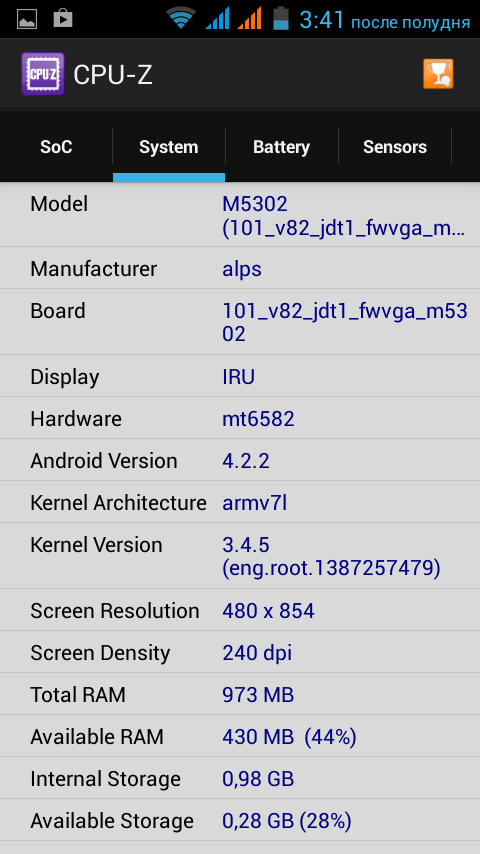 Смартфон IRU M5302 Gzhel работает под управлением операционной системы Android 4.2. На момент написания обзора каких-либо обновлений прошивки доступно не было. Root-доступ в рассматриваемом смартфоне не предоставляется.