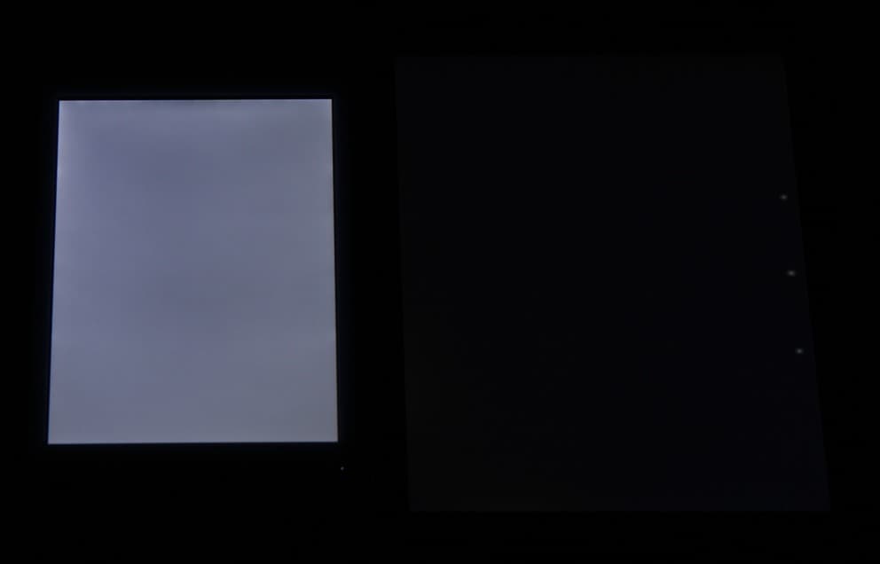 На экран этого смартфона изначально явно фабричным способом была наклеена защитная пленка, которую мы удалили. Лицевая поверхность экрана выполнена в виде стеклянной пластины с зеркально-гладкой поверхностью, устойчивой к появлению царапин. Судя по отражению объектов, имеется антибликовый фильтр, который по снижению яркости отражения хуже, чем у Google Nexus 7 (2013) (далее мы сравниваем именно с ним). Поверхность самой матрицы под стеклом слегка матовая, поэтому экран отражает как прямые источники света (внешней поверхностью), так и рассеянный свет (поверхностью матрицы), это уменьшает читаемость в условиях сильной внешней засветки. Для наглядности приведем фотографию, на которой в выключенных экранах обоих устройств отражается белая поверхность (IRU M5302 легко отличить, так как он меньше):