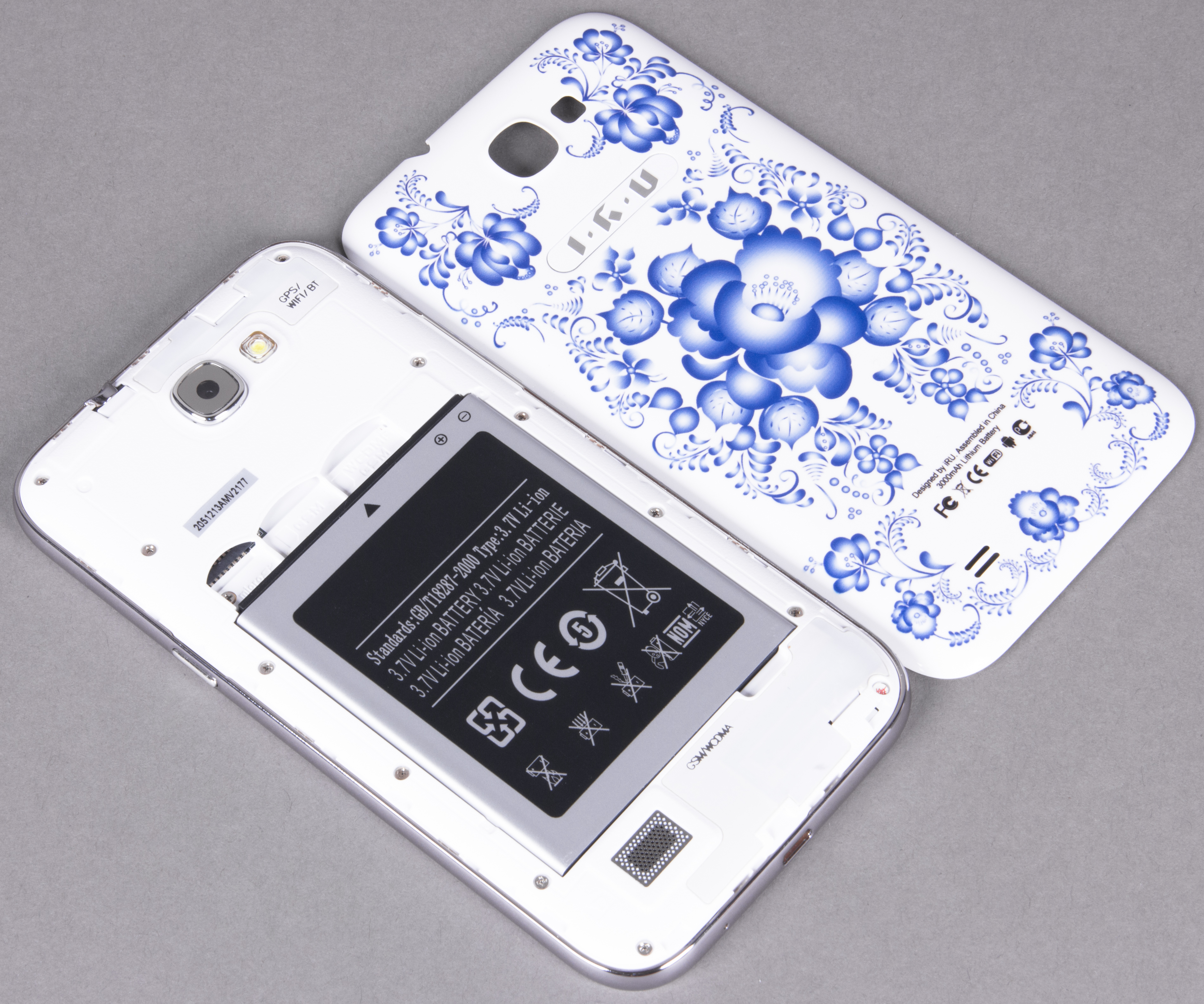 Взглянув на заднюю панель героя обзора, наконец понимаешь, откуда взялось слово «Gzhel» в названии смартфона: дизайнеры IRU нанесли рисунки, стилизованные под эту народно-промысловую керамику, на крышку аккумуляторного отсека. Красиво, но зачем тут же надо было ставить огромный логотип бренда, писать мелкими буквами информацию об изготовителе и логотипы поддерживаемых стандартов/технологий? Вся эта аляповатость портит впечатление от «аэрографии». Да и почему только на одну крышку? А не на весь смартфон и не на дополнительную крышку-чехол смартфона, которая осталась девственно белой? Почему фоновая картинка рабочего стола не стилизована под гжель? Почему не нарисована «гжельская» тема оформления для штатной оболочки? В общем, возможностей для придания уникального вида смартфону было полно, а выполнена эта стилизация, прямо скажем, халтурно.