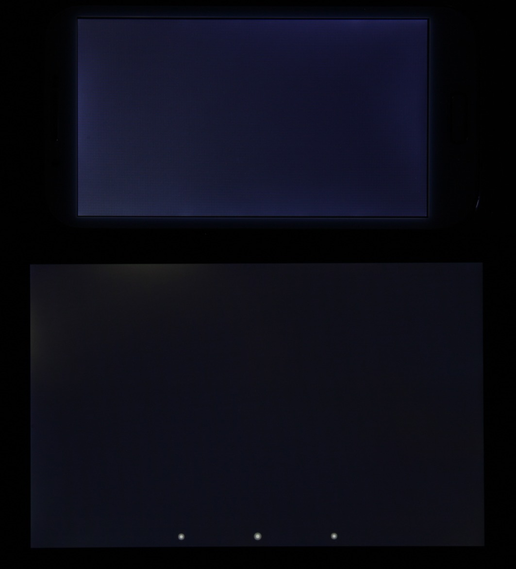 Экран имеет не самые плохие углы обзора в горизонтальном направлении, но при малейшем отклонении вверх инвертируются темные оттенки, а при отклонении вниз — светлые. Для сравнения приведем фотографии, на которых на экраны Nexus 7 и тестируемого устройства выведены одинаковые изображения, при этом яркость обоих экранов установлена примерно на 200 кд/м². Перпендикулярно к экранам тестовая картинка: