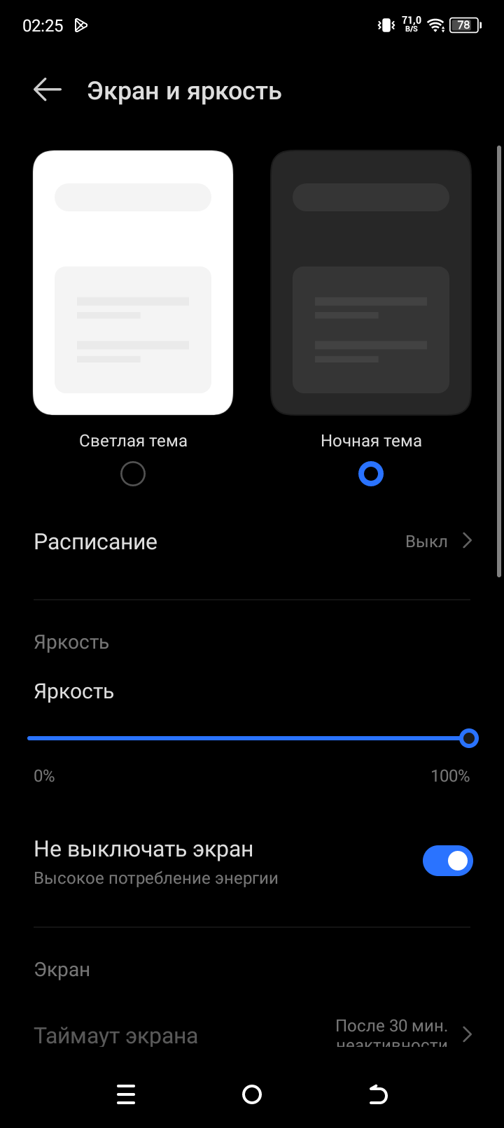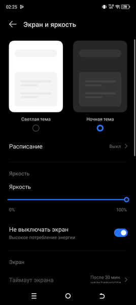 При ручном управлении яркостью и при выводе белого поля во весь экран максимальное значение яркости составило 390 кд/м². Максимальная яркость невысокая, но, учитывая отличные антибликовые свойства, смартфоном как-то можно будет пользоваться даже в солнечный день вне помещения. Минимальное значение яркости — 3 кд/м², поэтому в полной темноте яркость можно понизить до комфортного значения. Автоматической регулировки яркости по датчику освещенности нет. На любом уровне яркости значимая модуляция подсветки отсутствует, поэтому нет и никакого мерцания экрана.