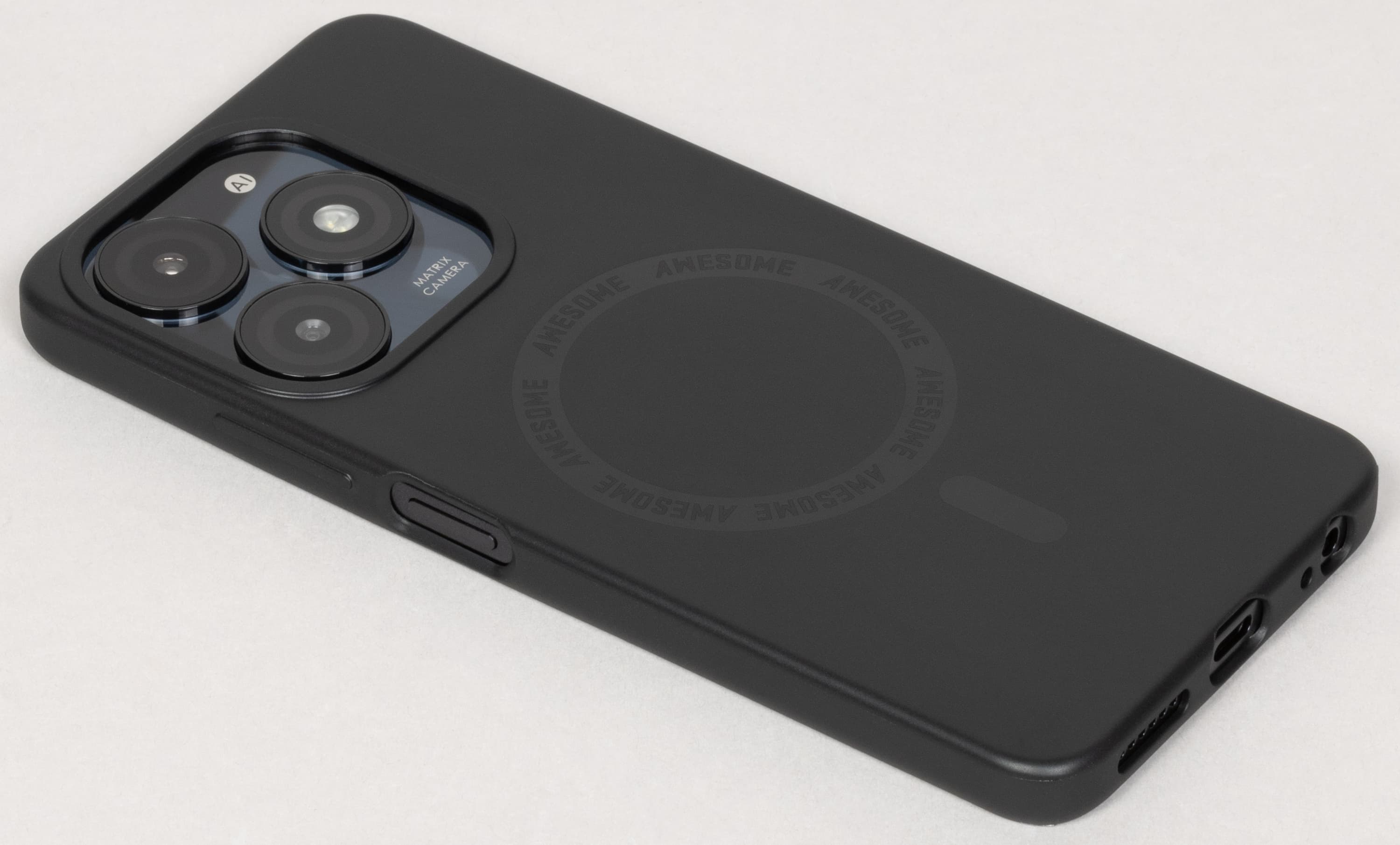 Комплектный силиконовый чехол — гибкий, но не прозрачный. Он выполнен в черном цвете и имеет геометрический рисунок, напоминающий известную беспроводную магнитную зарядку Apple.