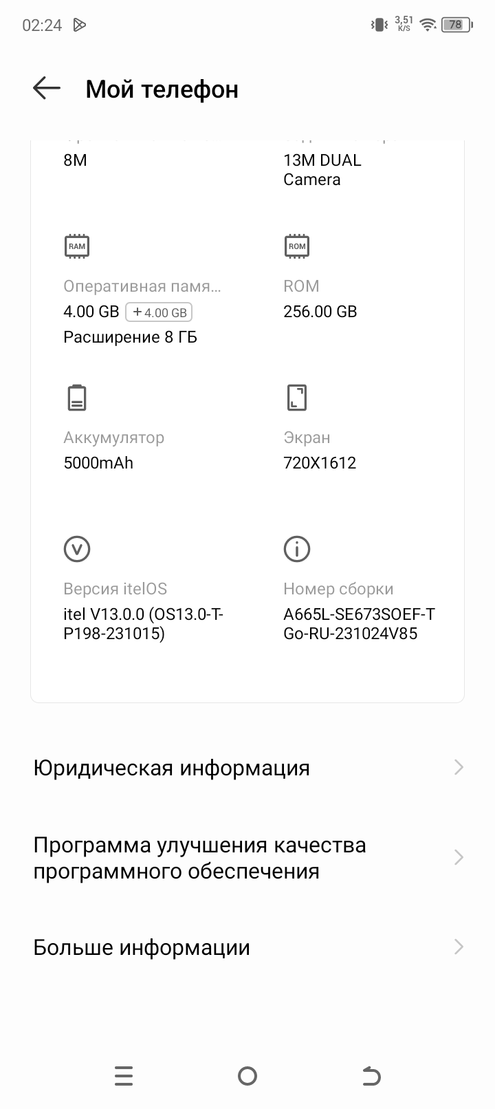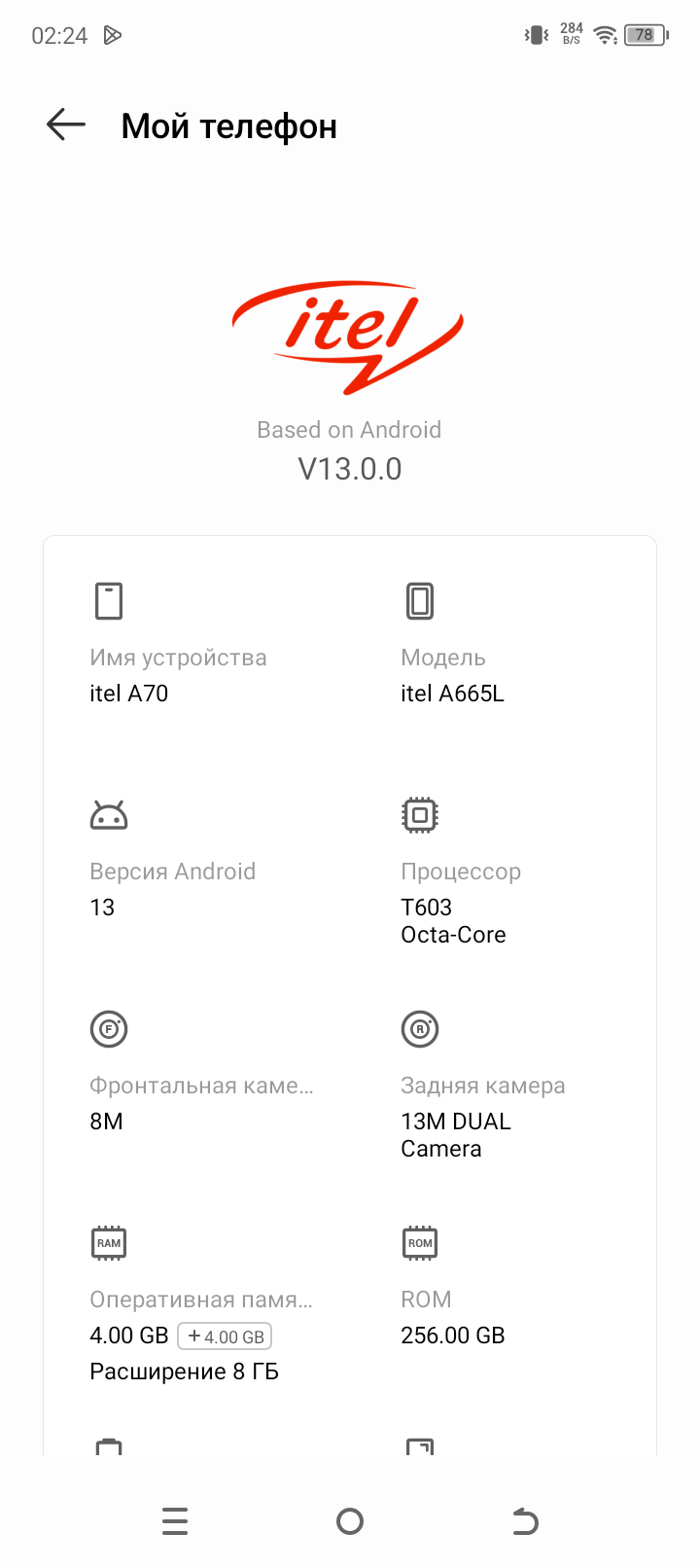 В качестве программной платформы Itel A70 использует ОС Android 13 с собственной оболочкой. В целом, это типичный китайский интерфейс с добротным переводом на русский язык, удаляемыми предустановленными приложениями и небольшим количеством рекламы — в основном, собственных же сервисов. Верхняя шторка разделена на две части в зависимости от места оттягивания. Официальный доступ к магазину и приложениям Google на месте.