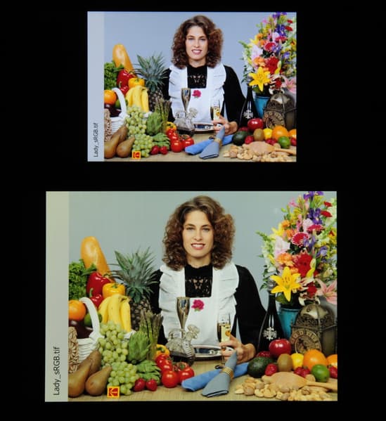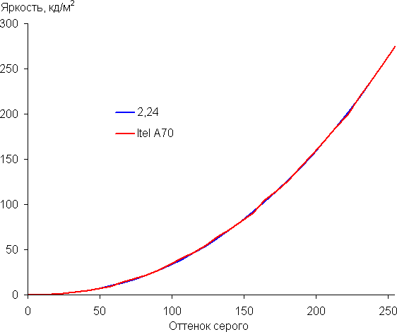 Построенная по 32 точкам с равным интервалом по численному значению оттенка серого гамма-кривая не выявила завала ни в светах, ни в тенях. Показатель аппроксимирующей степенной функции равен 2,24, что чуть выше стандартного значения 2,2. При этом реальная гамма-кривая мало отклоняется от степенной зависимости:
