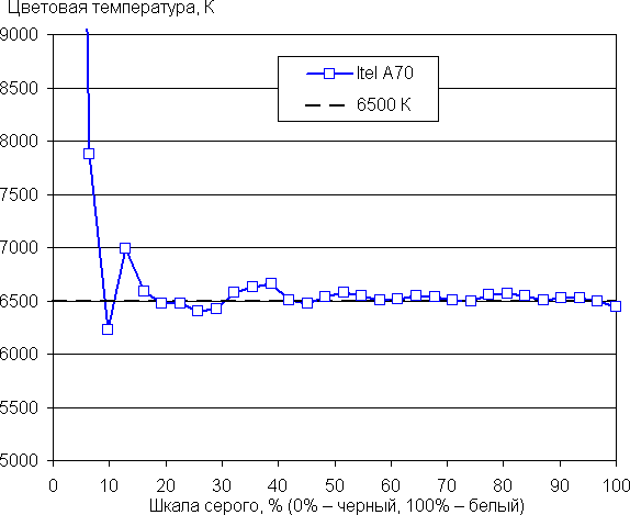По умолчанию баланс оттенков на шкале серого компромиссный, так как цветовая температура существенно выше стандартных 6500 К и равна 9500 К на белом фоне. Спасает настройка, позволяющая снизить интенсивность синей компоненты.