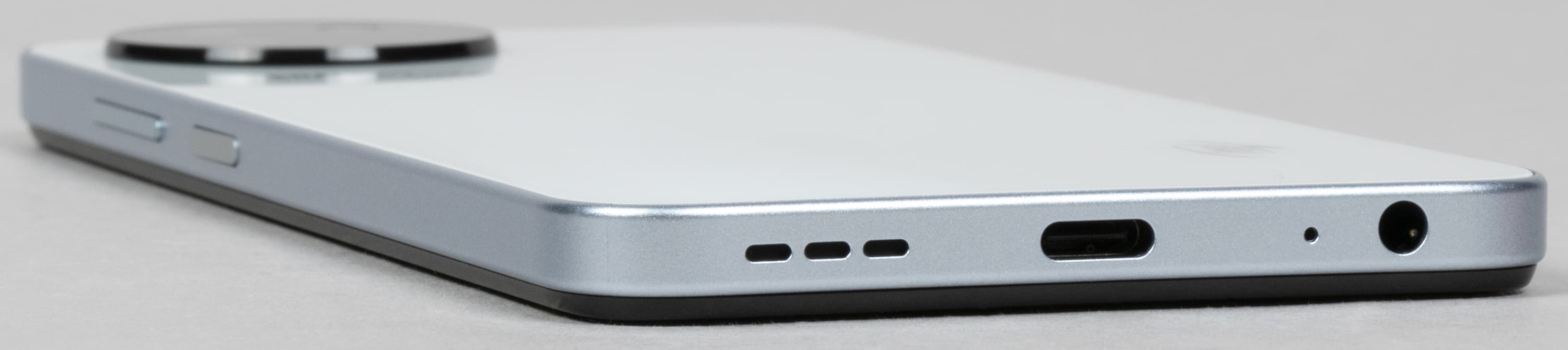 На торце снизу размещены динамик, микрофон и разъем USB Type-C. Для проводной гарнитуры имеется 3,5-миллиметровый аудиовыход.
