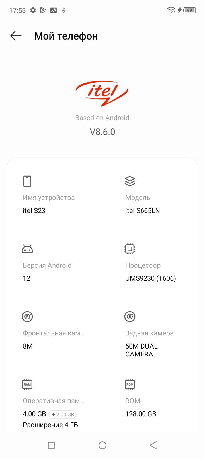 В качестве программной платформы смартфон Itel S23 использует ОС Android 12 с интерфейсом, практически не подвергшимся изменениям. Itel входит в холдинг Transsion вместе с Tecno и Infinix, но здесь нет оболочки, похожей на HiOS. Шторка с уведомлениями и быстрыми настройками разделена на две части. Магазин Google Play и сервисы Google — на месте.