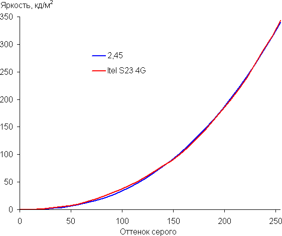 Построенная по 32 точкам с равным интервалом по численному значению оттенка серого гамма-кривая не выявила завала ни в светах, ни в тенях. Показатель аппроксимирующей степенной функции равен 2,45, что выше стандартного значения 2,2. При этом реальная гамма-кривая мало отклоняется от степенной зависимости: