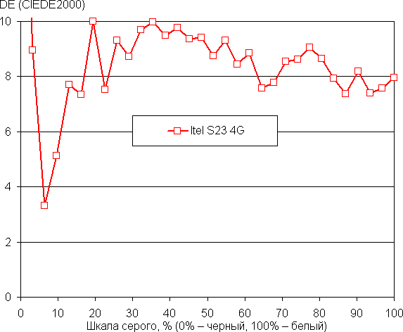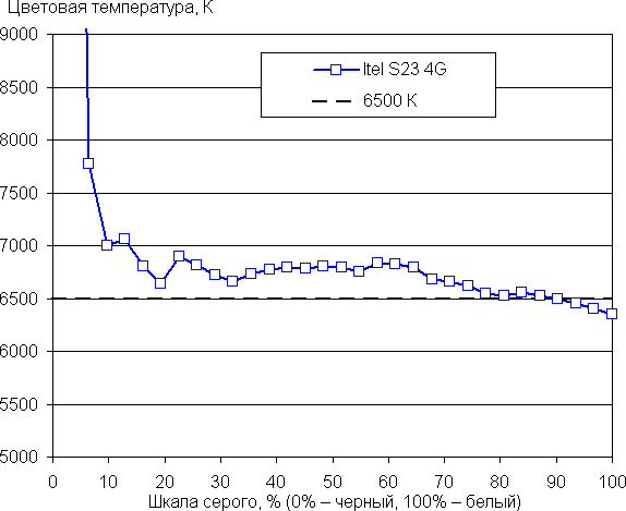 По умолчанию баланс оттенков на шкале серого компромиссный, так как цветовая температура существенно выше стандартных 6500 К и равна 10000 К на белом фоне. Спасает настройка, позволяющая снизить интенсивность синей компоненты.