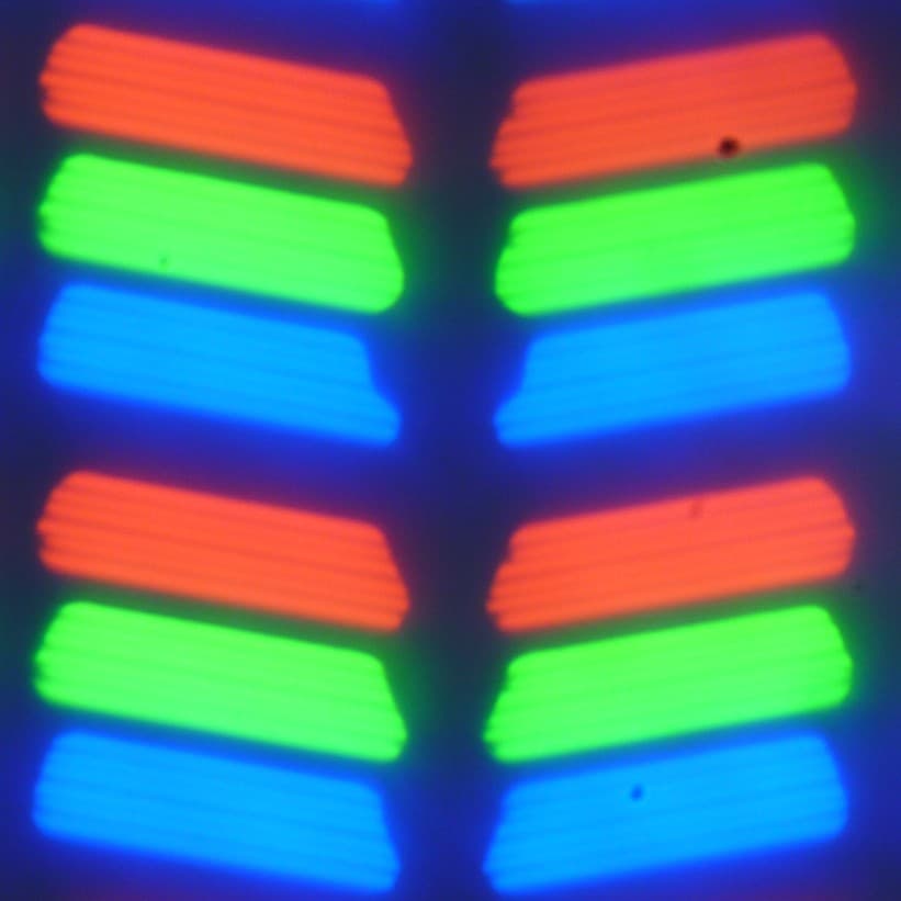 В данном смартфоне используется матрица типа IPS. Микрофотографии демонстрируют типичную для IPS структуру субпикселей: