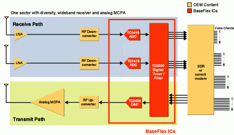 В чипсете BaseFlex используется новая технология преобразования данных, позволяющая сократить число этапов обработки входных и исходящих данных и уменьшить количество радиочастотных узлов. Чипсет способен обрабатывать полосы частот шириной до 75 МГц в стандартах второго, второго с половиной и третьего поколений (2G, 2.5G и 3G). Архитектура BaseFlex соответствует основным стандартам интерфейсов для базовых станций, в том числе CPRI (Common Public Radio Interface) и OBSAI (Open Base Station Architecture Interface), а сам чипсет состоит из следующих микрохем: 14-разрядный 240 MSPS аналого-цифровой преобразователь TC1410, многоканальный программируемый тюнер TC4000 и 14-разрядный 480 MSPS цифро-аналоговый преобразователь TC2400.