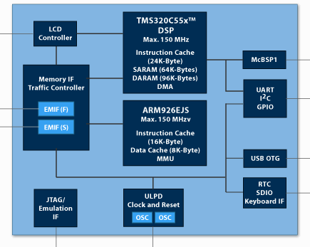 - Интерфейс ЖК-дисплея, встроенной камеры, встроенной ITU-R BT.656